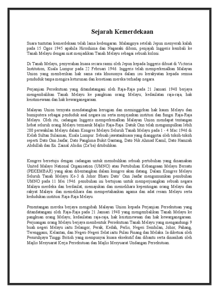 Sejarah Kemerdekaan from imgv2-1-f.scribdassets.com Persatuan cina tanah melayu (mca) telah ditubuhkan pada tahun 1949. Etnik melayu di tempatkan di kawasan kampong. Tunku abdul rahman mengetuai rombongan merundingkan kemerdekaan persekutuan tanah melayu di london. Pengisytiharaan kemerdekaan persekutuan tanah melayu dimulai pada jam 12.00 tengah malam pada 31 ogos 1957 di padang kelab selangor. Kronologi kearah pencapaian kemerdekaan tanah melayu 27 julai 1955. Wakil raja melayu terdiri daripada dato' panglima bukit gantang, abdul aziz othman, dato' mohd seth dan dato' nik ahmed kamil. Internet, proses kemerdekaan persekutuan tanah melayu. Penerunan bendera union jack menandakan kemerdekaan tanah melayu.