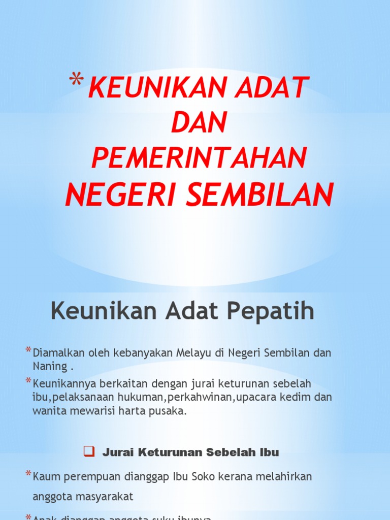 Kepada masyarakatnya terutama di kalangan wanita. Keunikan adat pepatih online worksheet for 2. Adat ini telah di bawa oleh masyarakat minangkabau yang berasal dari sumatra. ˈnəgəri səmbiˈlan) is a state in malaysia which lies on the western coast of peninsular malaysia. Siapa yang tidak mengenal jambi?